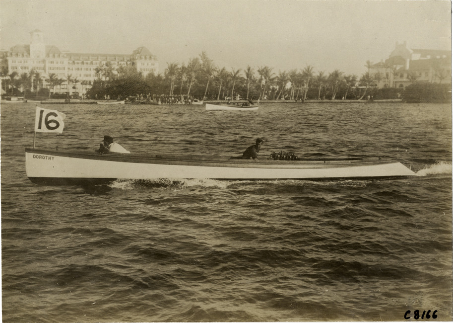 Favorite this☆ Motorboat "Dorothy" at Palm Beach boat races Description: View of motorboat "Dorothy" at Palm Beach boat races; flag with number "16" on boat. Hotel Royal Poinciana on shore in background. Handwritten on back: "Boat races--Palm Beach races, 1906." Details Resource ID: na005113 Subject: Motorboats--Florida--Palm Beach Motorboat racing--Florida--Palm Beach Hotels--Florida--Palm Beach Photographic prints Date Issued: 1906 Format: 1 photographic print ; 4.5 x 6 in. Member of: National Automotive History Collection Lazarnick Collection Filing Location: Boat races--Palm Beach races, 1906 #1 Negative Number: Negative #C8166 Rights: Physical rights are retained by DPL. Copyright is retained in accordance with U.S. copyright laws.