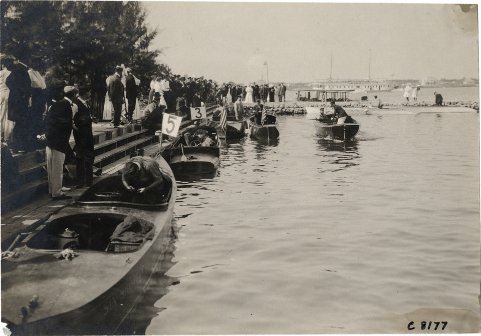 View of motorboats "Six Shooter," "Mercedes" and "Topsy" moored to dock at Palm Beach boat races. Spectators stand on dock. Stamped on back: "Photo by N. Lazarnick, 29 West 42nd Street, New York." Handwritten on back: "Boat races--Palm Beach races, 1906. General view of the motor lying at the pier."