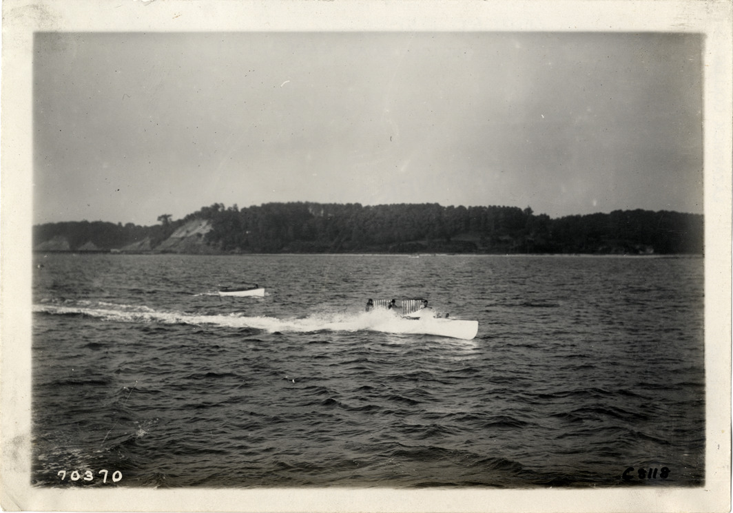 View of motorboat at Huntington boat races, Huntington Bay, Long Island, New York. Stamped on back: "Spooner & Wells, Inc., photographers, telephones 3472-3473 Columbus, 1931 Broadway, New York." Handwritten on back: "Boat races--Huntington boat races, 1911."
