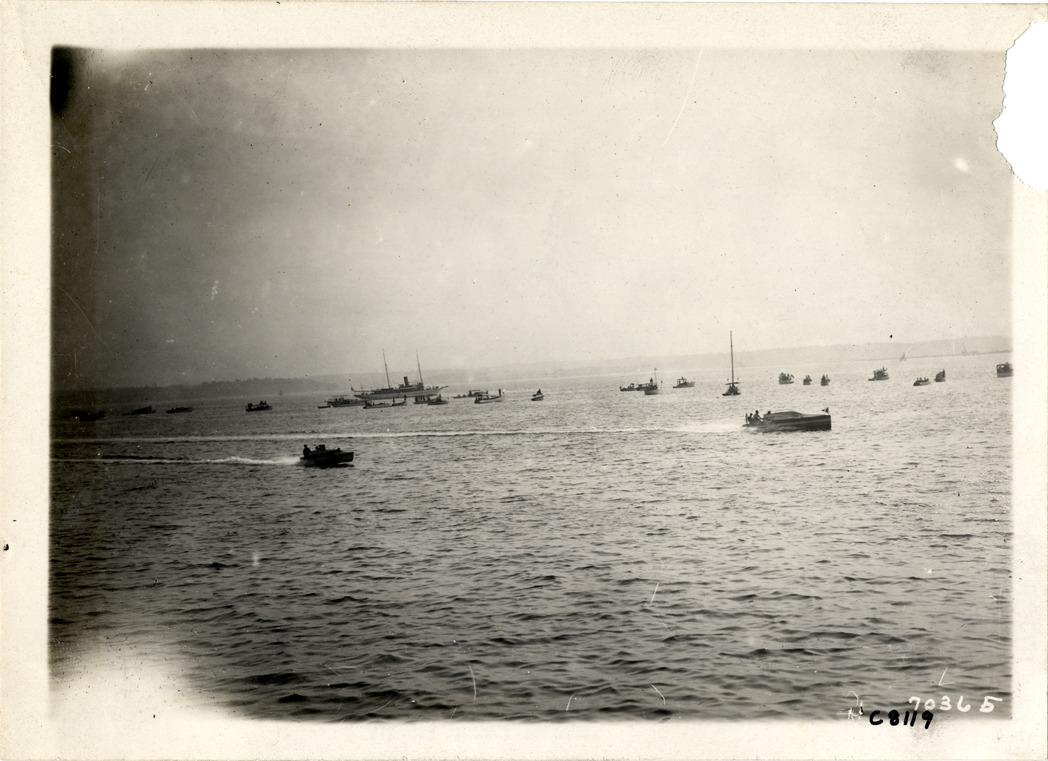 Distant view of motorboats at Huntington boat races, Huntington Bay, Long Island, New York; boats in background. Stamped on back: "Spooner & Wells, Inc., photographers, telephones 3472-3473 Columbus, 1931 Broadway, New York." Handwritten on back: "Boat races--Huntington boat races, 1911."