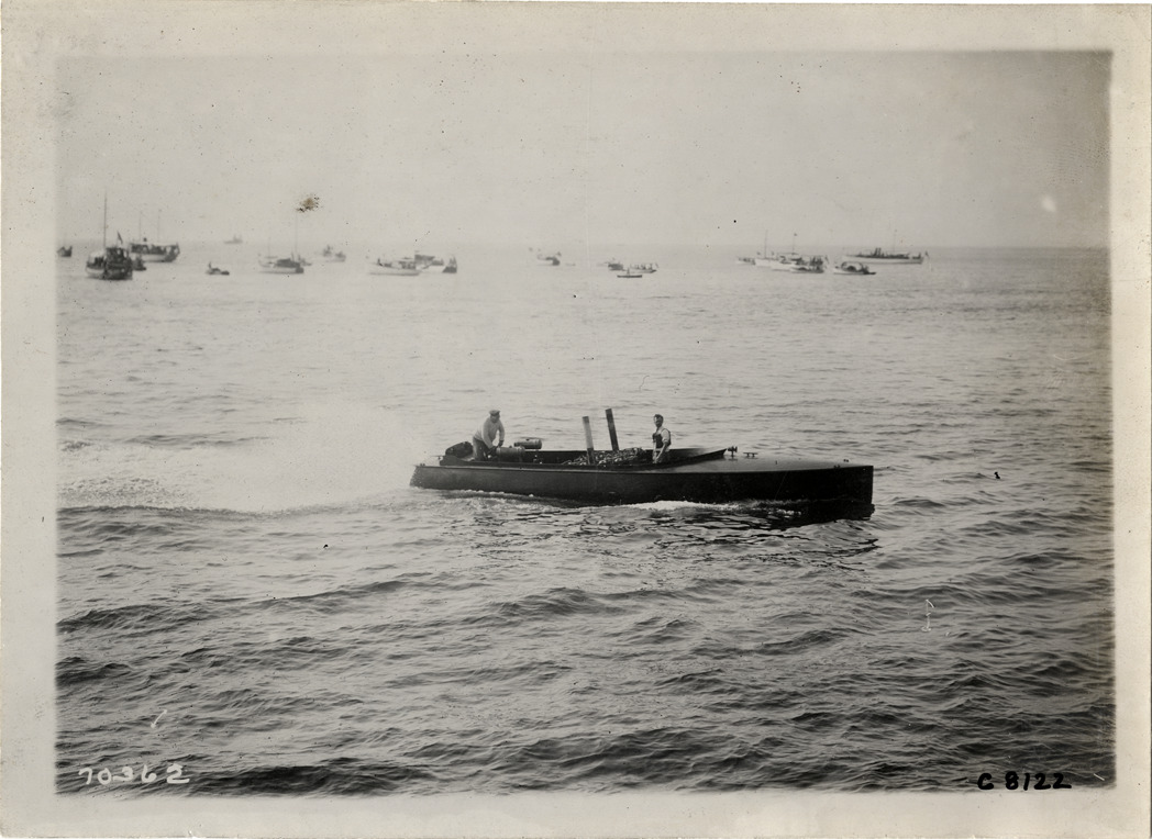View of two men in motorboat at Huntington boat races, Huntington Bay, Long Island, New York. Stamped on back: "Spooner & Wells, Inc., photographers, telephones 3472-3473 Columbus, 1931 Broadway, New York." Handwritten on back: "Boat races--Huntington boat races, 1911."