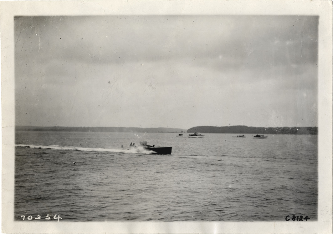 View of motorboat at Huntington boat races, Huntington Bay, Long Island, New York. Stamped on back: "Spooner & Wells, Inc., photographers, telephones 3472-3473 Columbus, 1931 Broadway, New York." Handwritten on back: "Boat races--Huntington boat races, 1911."