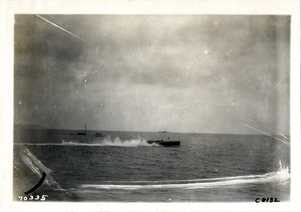 Distant view of motorboat at Huntington boat races, Huntington Bay, Long Island, New York. Stamped on back: "Spooner & Wells, Inc., photographers, telephones 3472-3473 Columbus, 1931 Broadway, New York." Handwritten on back: "Boat races--Huntington boat races, 1911."