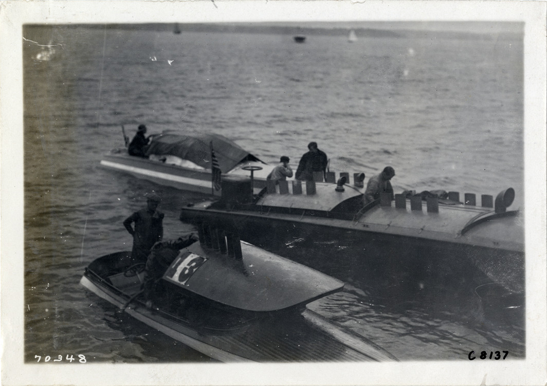 View of three motorboats at Huntington boat races, Huntington Bay, Long Island, New York. Sign with number "13" on boat in foreground. Stamped on back: "Spooner & Wells, Inc., photographers, telephones 3472-3473 Columbus, 1931 Broadway, New York." Handwritten on back: "Boat races--Huntington boat races, 1911."
