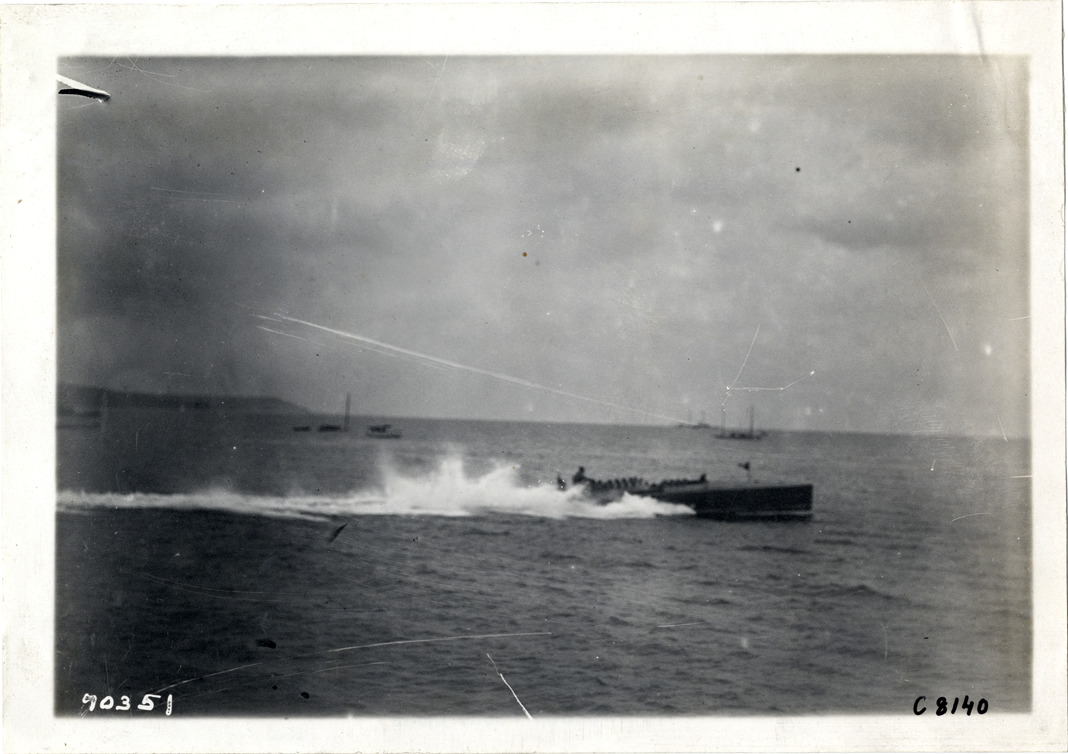 View of motorboat at Huntington boat races, Huntington Bay, Long Island, New York; shoreline in background. Stamped on back: "Spooner & Wells, Inc., photographers, telephones 3472-3473 Columbus, 1931 Broadway, New York." Handwritten on back: "Boat races--Huntington boat races, 1911."