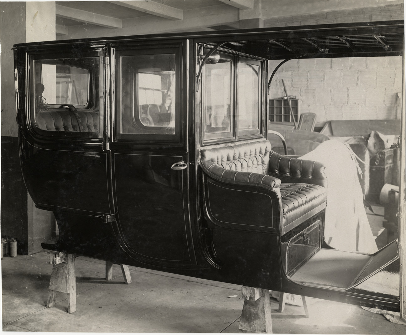 Favorite this☆ Automobile body in workshop Description: View of automobile body in workshop, balanced on two sawhorses. Stamped on back: "Spooner & Wells, Inc., photographers, telephones 3472-3473 Columbus, 1931 Broadway, New York." Handwritten on back: "Bodies--Unidentified, 1908." Details Resource ID: na005170 Creator: Spooner & Wells Subject: Automobiles--Bodies--Design and construction Photographers--New York (State)--New York Photographic prints Date Issued: 1908 Format: 1 photographic print ; 7.25 x 8.75 in. Member of: National Automotive History Collection Lazarnick Collection Filing Location: Bodies--Unidentified Rights: Physical rights are retained by DPL. Copyright is retained in accordance with U.S. copyright laws.