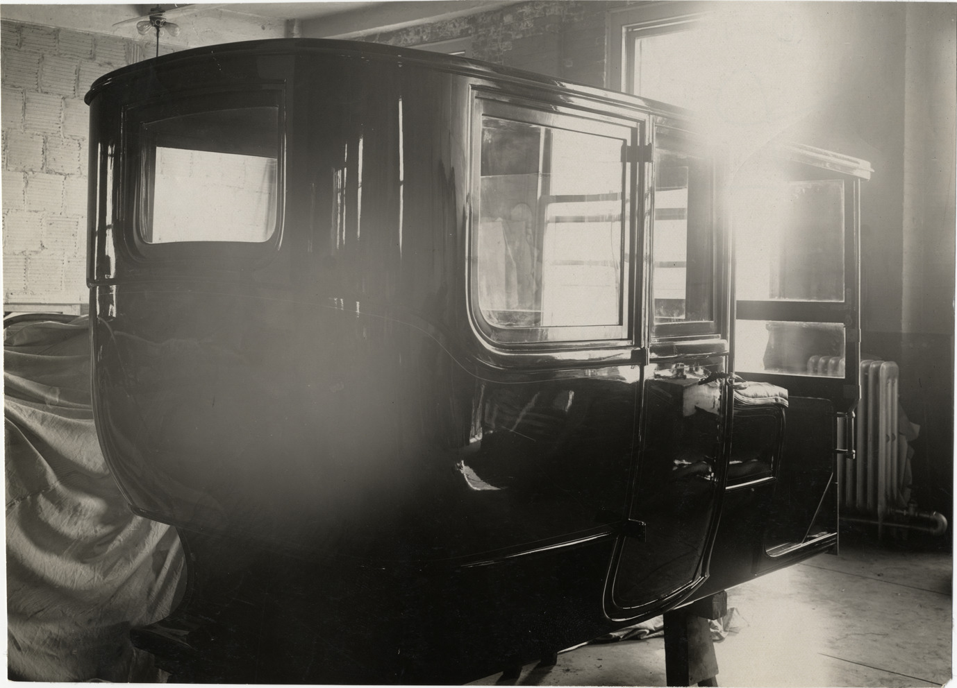 View of automobile body in workshop. Handwritten on back: "Bodies--Unidentified, 1908."