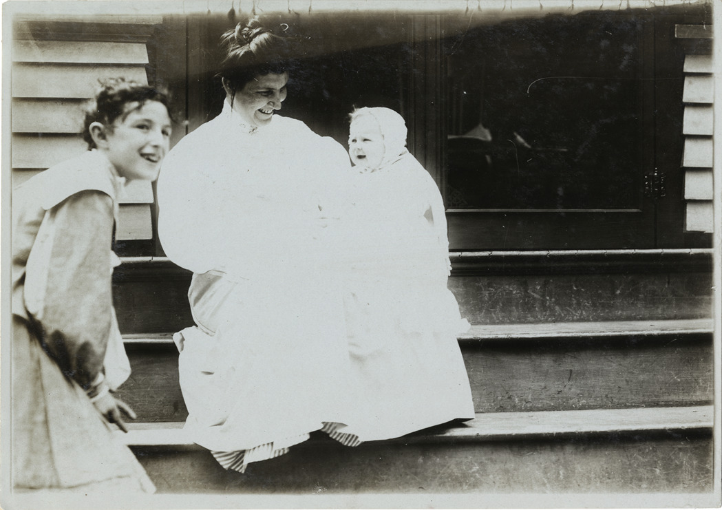 View of woman, girl and baby sitting on porch steps. Stamped on back: "Photo by F. Ed. Spooner, 1536 B'way, telephone 6536-38th St., New York, N.Y." Handwritten on back: "Bourgeoisie."