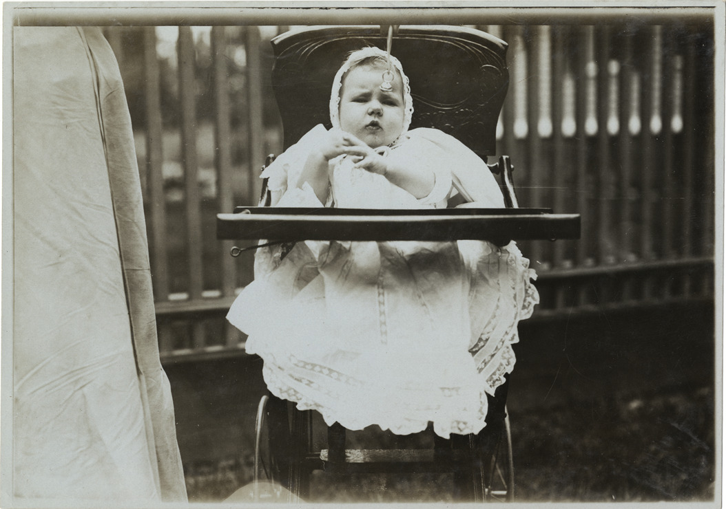 View of baby wearing white dress and bonnet, sitting in highchair. Fence in background. Stamped on back: "Photo by F. Ed. Spooner, 1536 B'way, telephone 6536-38th St., New York, N.Y." Handwritten on back: "Bourgeoisie."