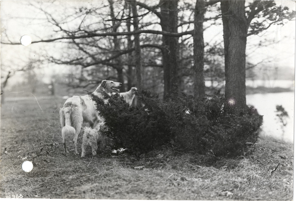 Favorite this☆ Dogs on Pelletier farm Description: View of dogs standing near bush and trees at Pelletier farm. Handwritten on back: "Bourgeoisie. On Mr. Pelletier's farm." Details Resource ID: na005251 Subject: Dogs--Michigan--Orchard Lake Pelletier, E. LeRoy, 1868-1938--Homes and haunts--Michigan--Orchard Lake Photographic prints Date Issued: Unknown year Format: 1 photographic print ; 4.5 x 6.5 in. Member of: National Automotive History Collection Lazarnick Collection Filing Location: Bourgeoisie #3 Rights: Physical rights are retained by DPL. Copyright is retained in accordance with U.S. copyright laws.