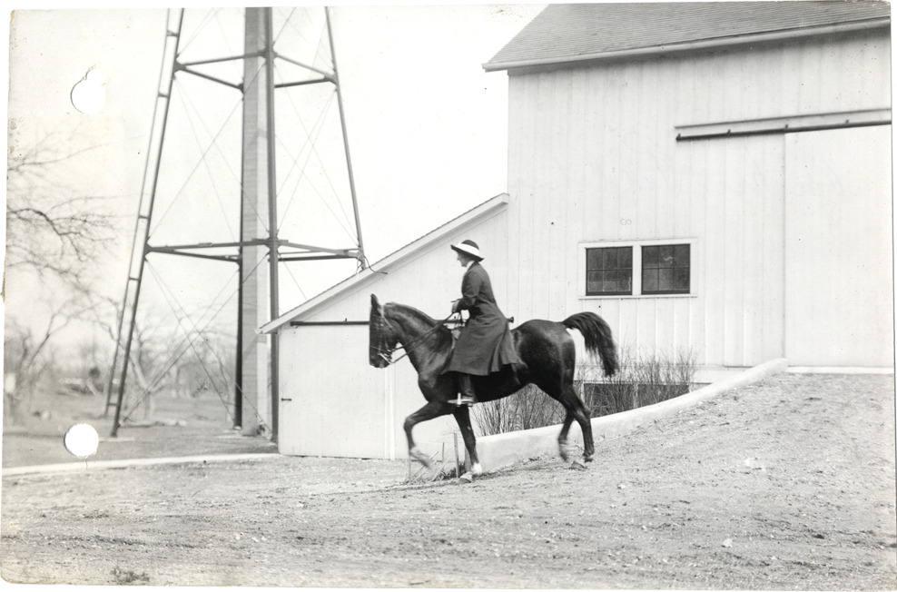 Mrs. E. LeRoy Pelletier on horseback at Pelletier farm