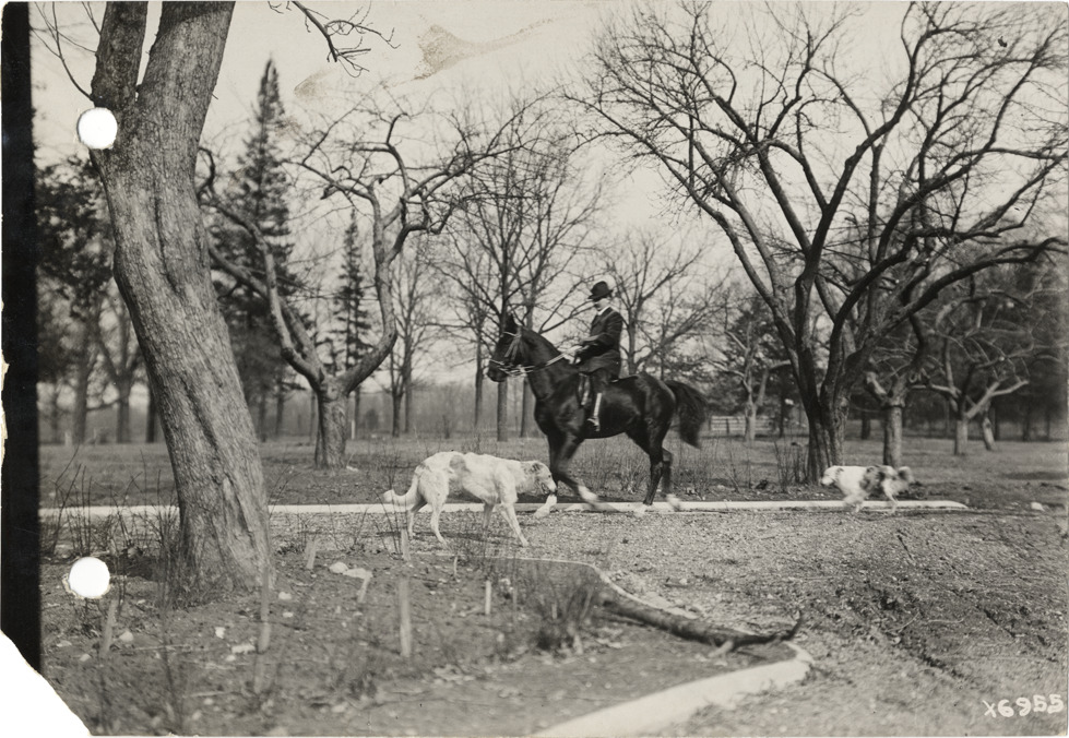 View of E. LeRoy Pelletier on horseback at his farm; two dogs in foreground. Handwritten on back: "Bourgeoisie. Mr. Pelletier on his farm."