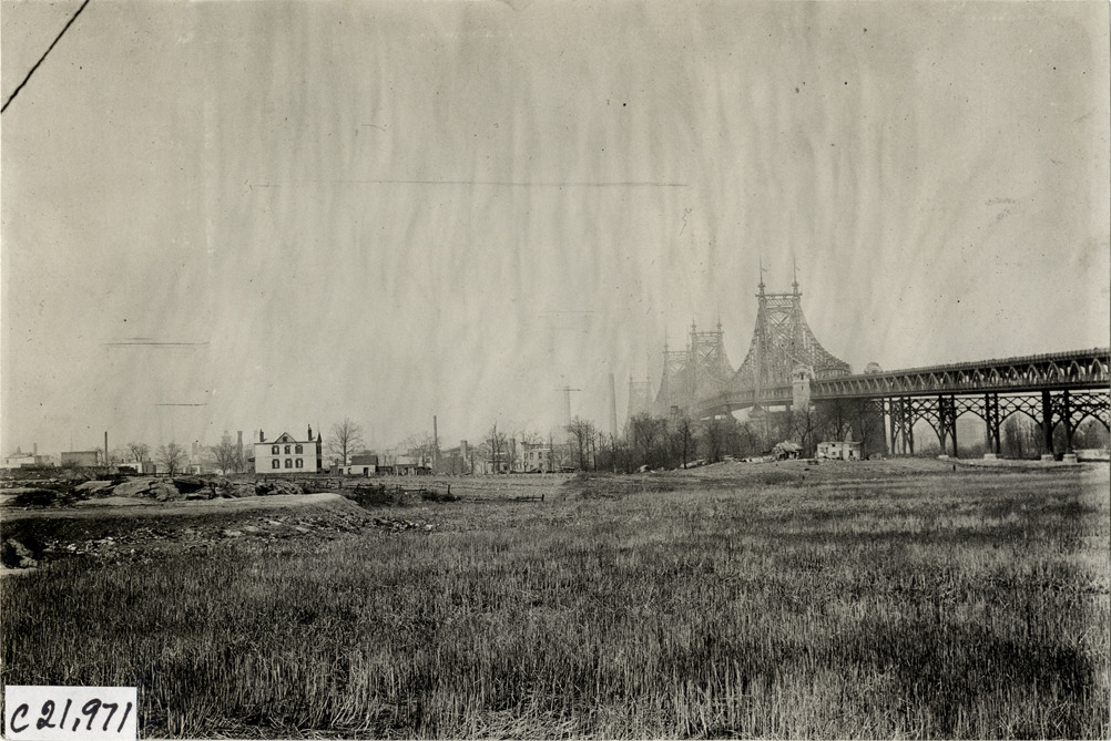 Distant view of Queensboro Bridge. Field in foreground; houses in background. Stamped on back: "Spooner & Wells, Inc., photographers, telephones 3472-3473 Columbus, 1931 Broadway, New York." Handwritten on back: "Bridges--Queensboro Bridge, 1909, folder #1."