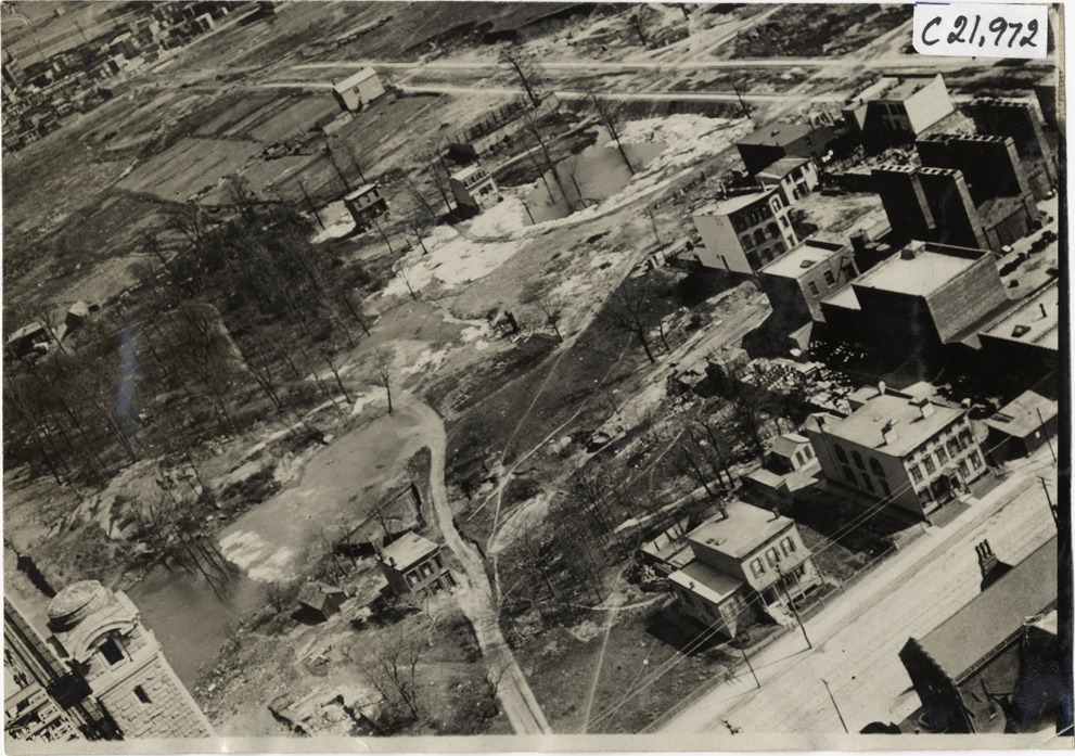 View of buildings near Queensboro Bridge. Section of bridge visible on left. Stamped on back: "Spooner & Wells, Inc., photographers, telephones 3472-3473 Columbus, 1931 Broadway, New York." Handwritten on back: "Bridges--Queensboro Bridge, 1909, folder #1."