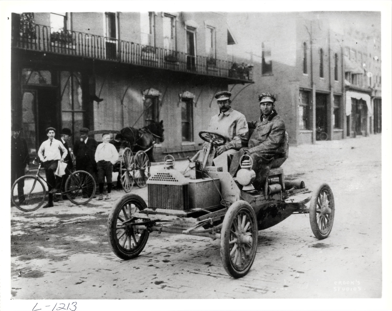 View of two men sitting in 1904 Buick car. Commercial buildings, horse-drawn wagon and boy with bicycle in background. Handwritten on back: "Buick, 1904. First running model went between Detroit and Flint."