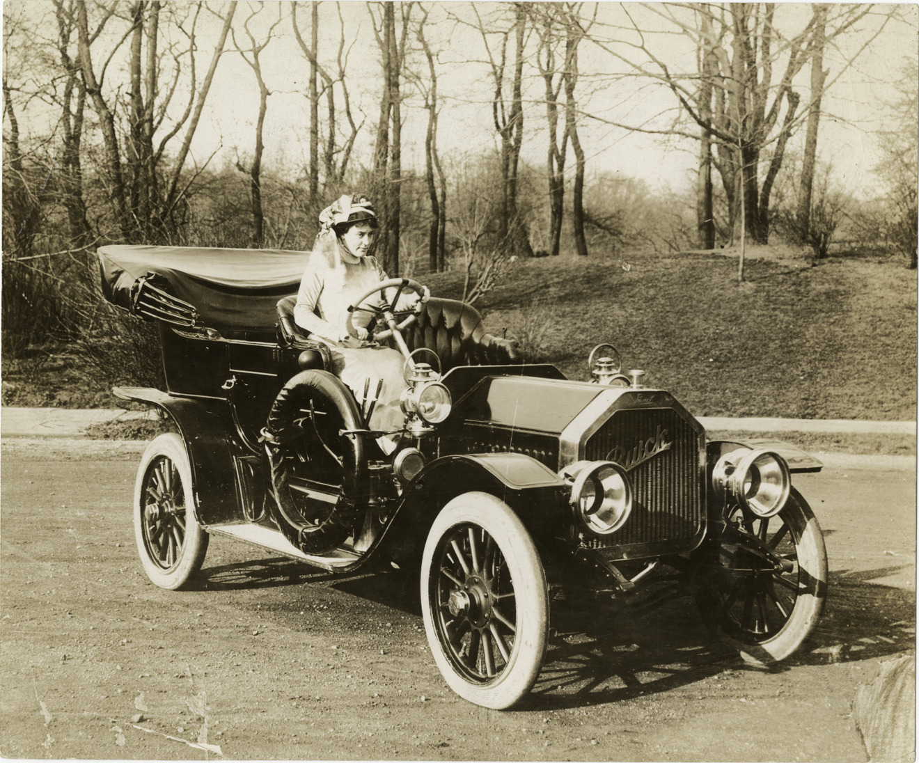 Favorite this☆ Woman in 1906 Buick automobile Description: View of woman sitting in 1906 Buick car. Stamped on back: "Photo by N. Lazarnick." Handwritten on back: "Buick, 1906. Stylish lady in a Buick, 1906." Details Resource ID: na005337 Creator: Lazarnick, Nathan Subject: Buick automobile Women automobile drivers Photographers--New York (State)--New York Photographic prints Date Issued: 1906 Format: 1 photographic print ; 7.5 x 9 in. Member of: National Automotive History Collection Lazarnick Collection Filing Location: Buick Negative Number: Negative #708NQ Rights: Physical rights are retained by DPL. Copyright is retained in accordance with U.S. copyright laws.