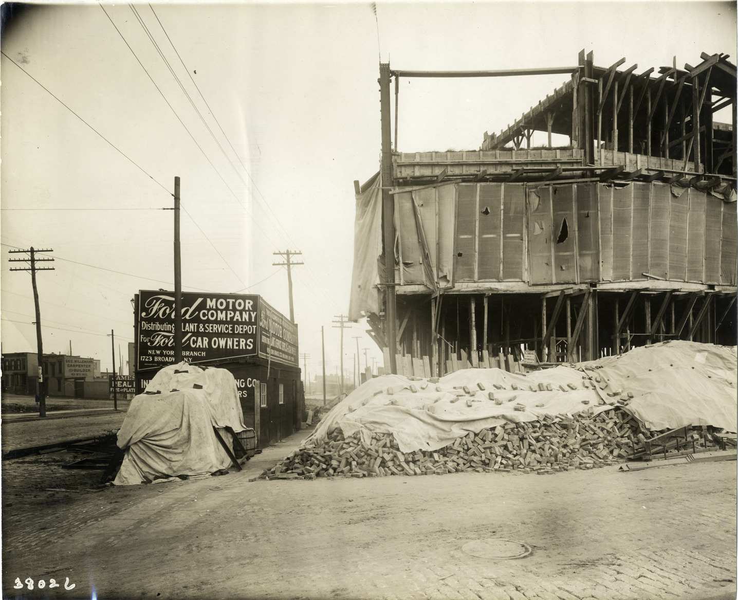 View of Ford Motor Company distributing plant and service depot under construction; pile of bricks partially covered by tarpaulin in foreground. Painted on small building on left: "Ford Motor Company, distributing plant & service depot for Ford car owners, New York branch, 1723 Broadway, N.Y." Stamped on back: "Spooner & Wells, Inc., photographers, telephones 3472-3473 Columbus, 1931 Broadway, New York." Handwritten on back: "Building construction, 1910."