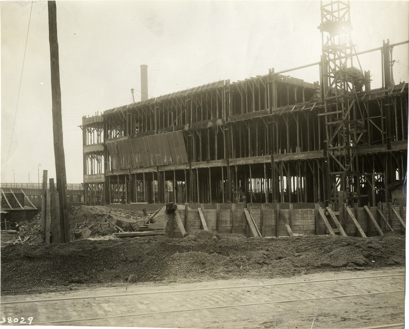View of Ford Motor Company distributing plant and service depot under construction. Stamped on back: "Spooner & Wells, Inc., photographers, telephones 3472-3473 Columbus, 1931 Broadway, New York." Handwritten on back: "Building construction, 1910."