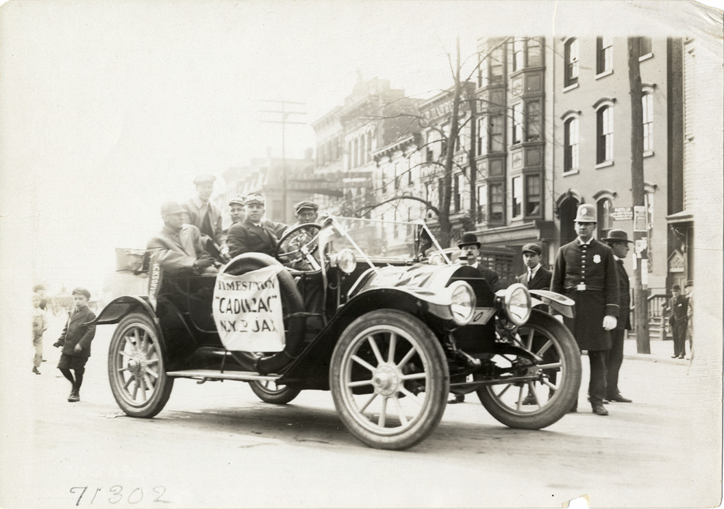 View of motorists sitting in 1911 Cadillac car; policeman stands near front of car. Banner on automobile reads: "Times Union, Cadillac, N.Y. to Ja[?]." Stamped on back: "Spooner & Wells, Inc., photographers, telephones 3472-3473 Columbus, 1931 Broadway, New York." Handwritten on back: "1911 Cadillac."