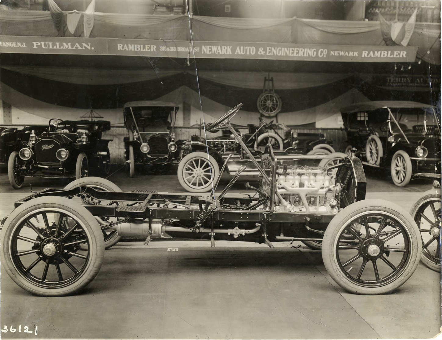 View of 1909-1910 Cadillac automobile chassis at Newark Automobile Show. Automobiles in background; sign over display reads: "Rambler, 316 & 318 Broad St., Newark Auto & Engineering Co., Newark Rambler." Stamped on back: "Spooner & Wells, Inc., photographers, telephones 3472-3473 Columbus, 1931 Broadway, New York." Handwritten on back: "Cadillac, 1910. 1909/10 Newark Automobile Show. 1909 or 1910 Cadillac 'Thirty', 4 cy., 30 h.p., 106" whb, stripped chassis. Exhibited: Newark Car Show. Photograph by Spooner & Wells, 1931 Broadway, NYC. Negative #36121."