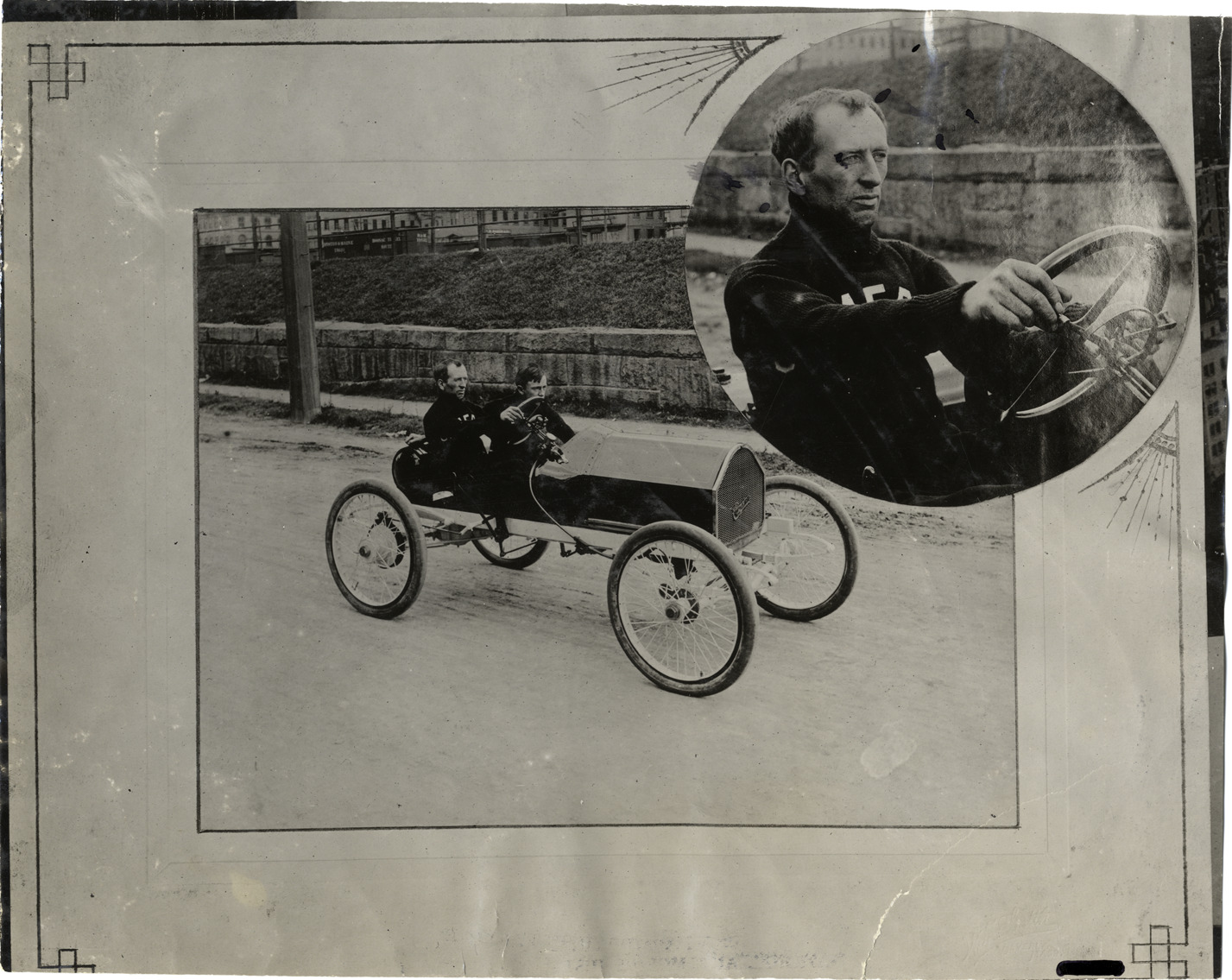 View of driver and passenger in 1908 Camercon racecar with inset of portrait of driver. Handwritten on back: "Cameron, 1908."