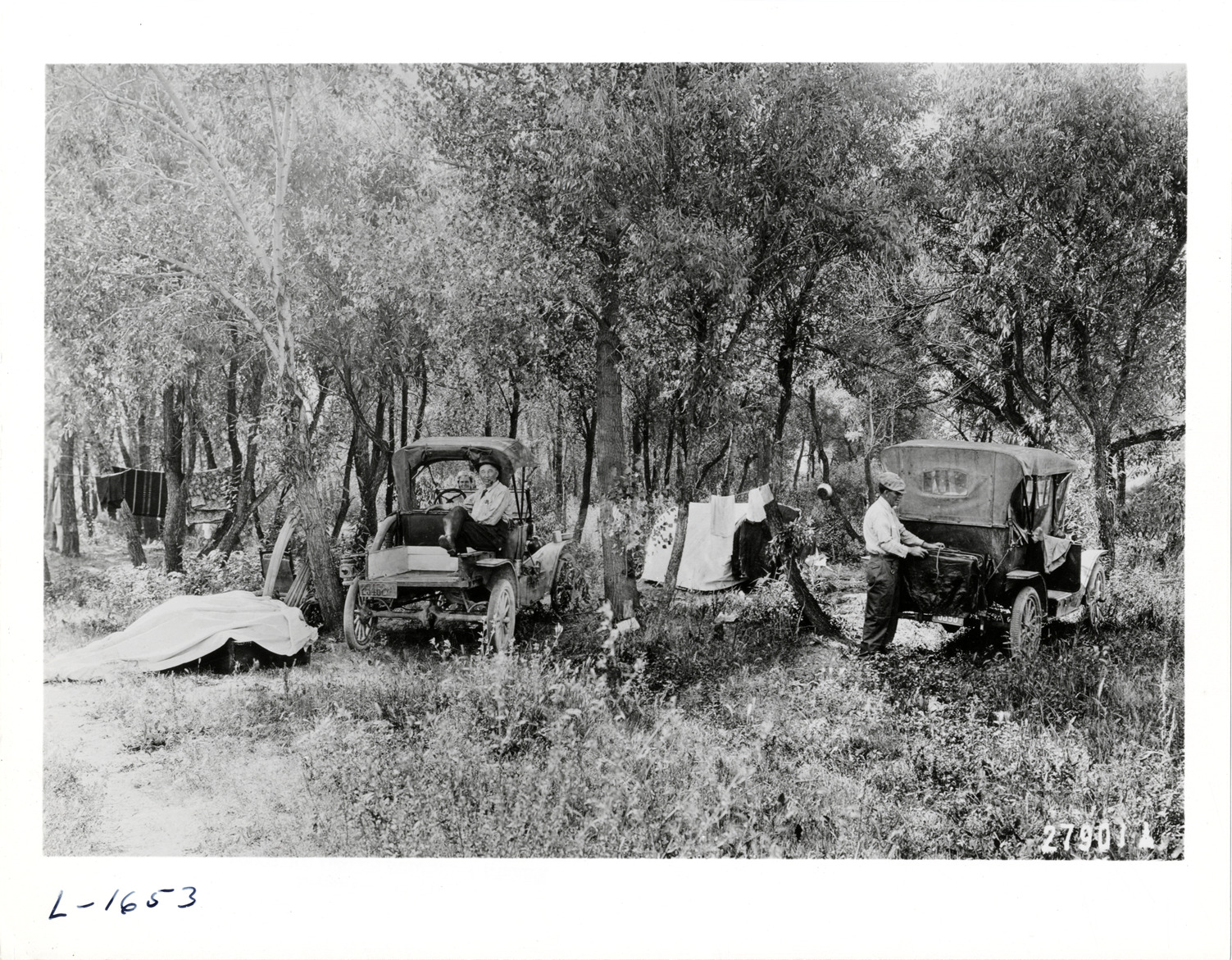 View of motorists camping with cars in woods; laundry on clotheslines in background. Handwritten on back: "Camping. Automobile camping in 1916."