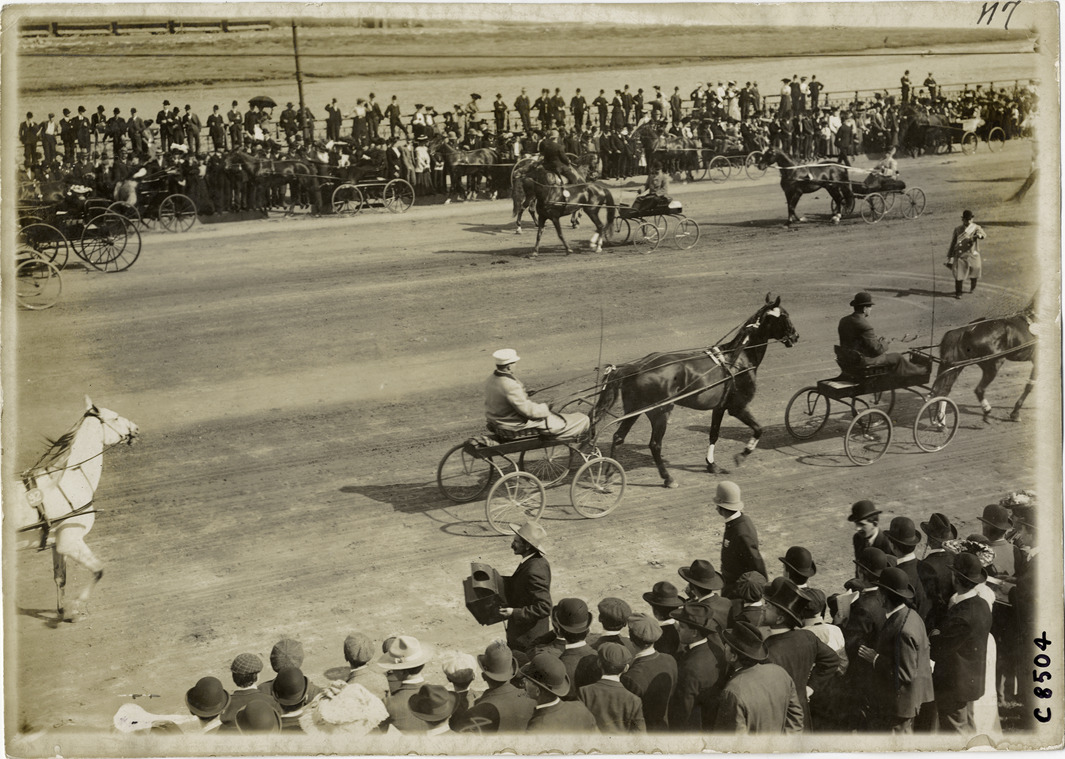 Favorite this☆ Spectators watching horse-drawn carriage race Description: View of spectators watching a horse-drawn carriage race. Handwritten on back: "Carriages, 1904." Details Resource ID: na005425 Subject: Horse-drawn vehicles Horse racing Photographic prints Date Issued: 1904 Format: 1 photographic print ; 5 x 7 in. Member of: National Automotive History Collection Lazarnick Collection Filing Location: Carriages Negative Number: Negative #C8504 Rights: Physical rights are retained by DPL. Copyright is retained in accordance with U.S. copyright laws.