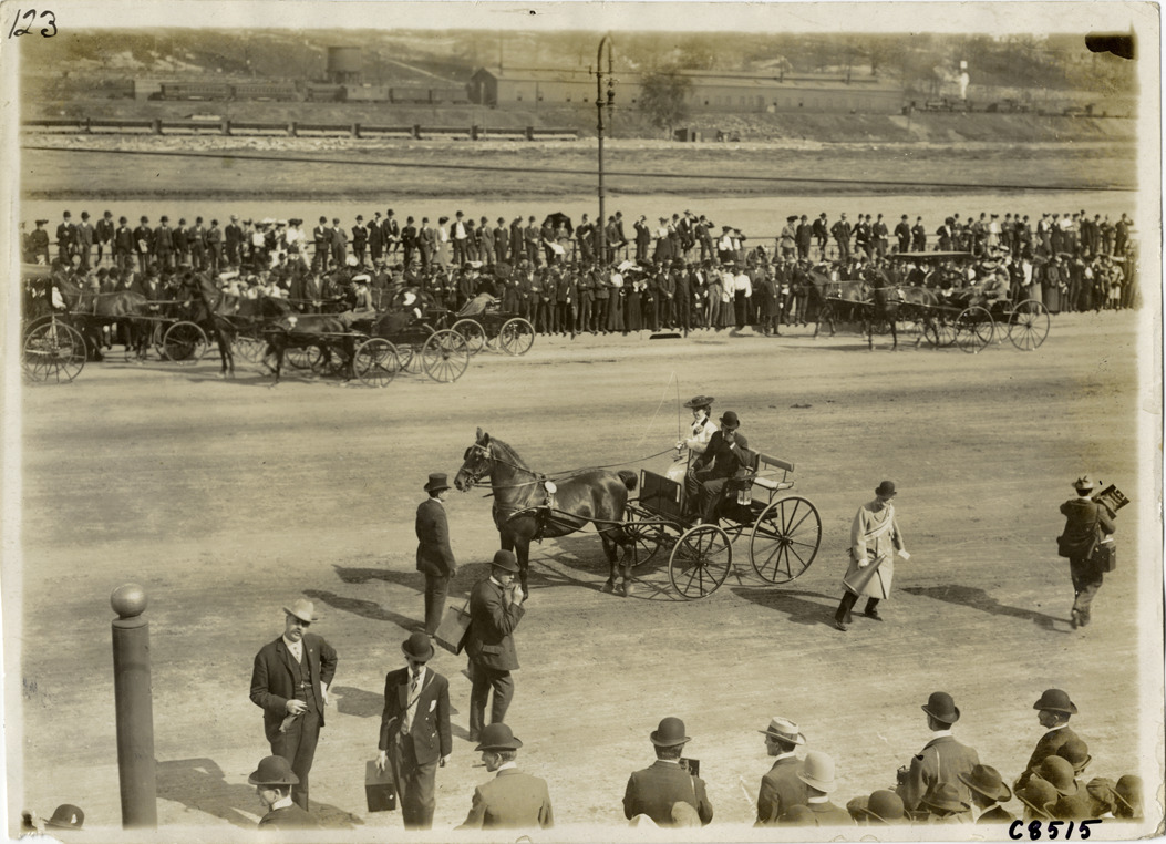 View of woman and passenger in horse-drawn carriage at race; spectators in background. Handwritten on back: "Carriages, 1904."