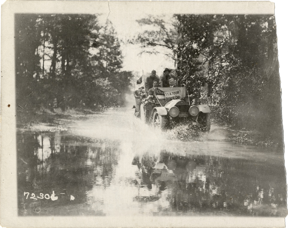 View of motorists in 1910 Chalmers car, traveling on flooded road. Banner on car reads: "T.C.A. Tour official car." Stamped on back: "Spooner & Wells, Inc., photographers, telephones 3472-3473 Columbus, 1931 Broadway, New York." Handwritten on back: "Chalmers, 1910."