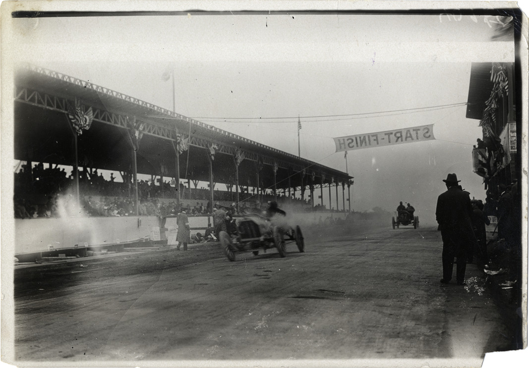View of Chalmers racecar in automobile race. "Start-finish" banner in background. Stamped on back: "Spooner and Wells, 1931 Broadway, New York, duplicates any time, enlargements all sizes, tel. 3472-3473 Col., credit appreciated." Handwritten on back: "Chalmers, 1908. Chalmers-Detroit."