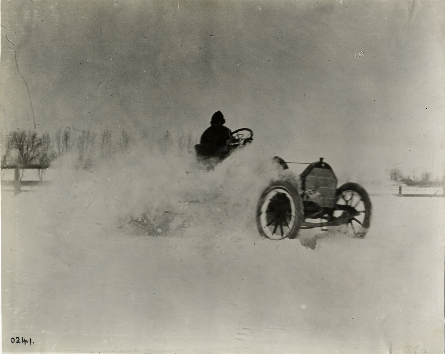 View of motorist driving 1910 Chalmers car through snow. Stamped on back: "Spooner & Wells, Inc., photographers, telephone North 1745. 1231 Woodward Ave., Detroit, Mich. Detroit, 1231 Woodward, New York, 1931 Broadway." Handwritten on back: "Chalmers, 1910."