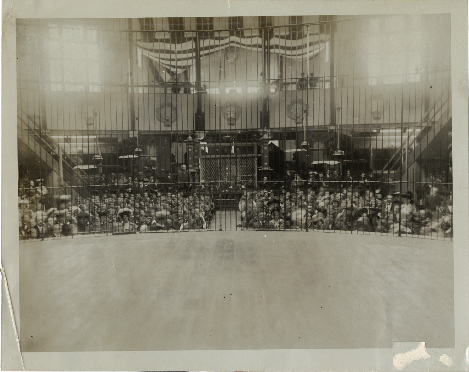 Favorite this☆ Audience viewed through animal cage at circus Description: Audience viewed through interior of animal cage at circus. Handwritten on back: "Circuses." Details Resource ID: na005512 Subject: Animal cages Circus Audiences Photographic prints Date Issued: Unknown year Format: 1 photographic print ; 8 x 10 in. Member of: National Automotive History Collection Lazarnick Collection Filing Location: Circuses Rights: Physical rights are retained by DPL. Copyright is retained in accordance with U.S. copyright laws.