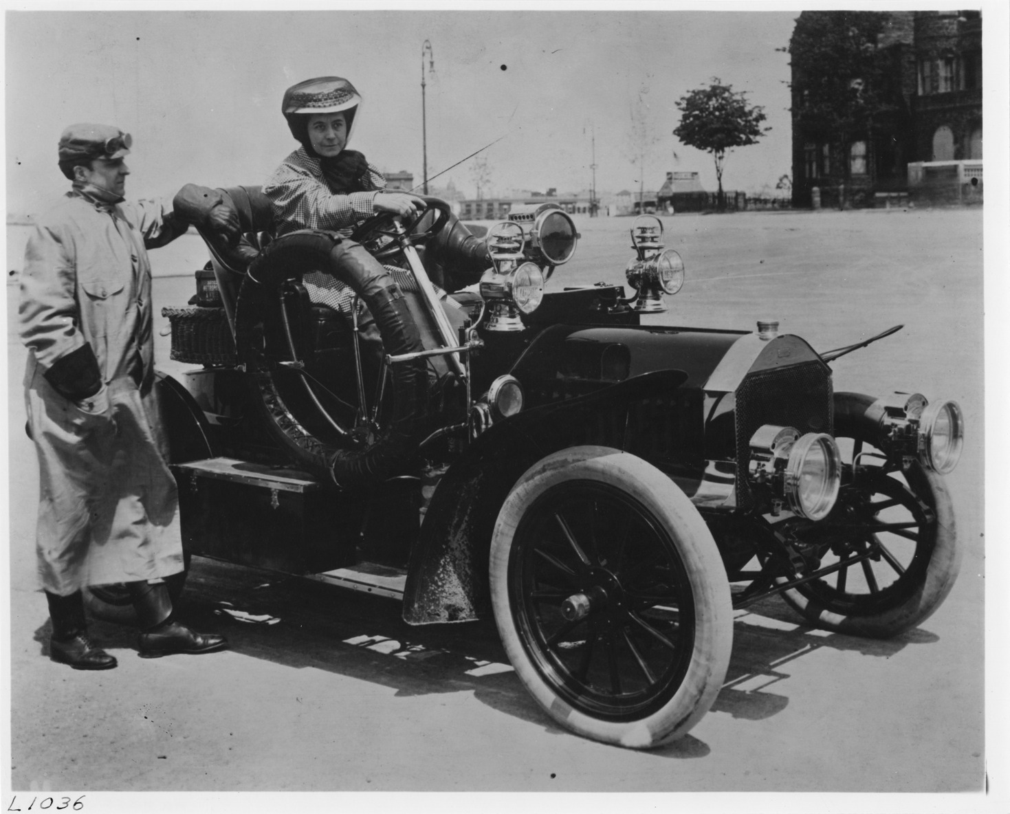 View of woman sitting in Cleveland car; man in driving coat stands next to automobile. Handwritten on back: "Cleveland."