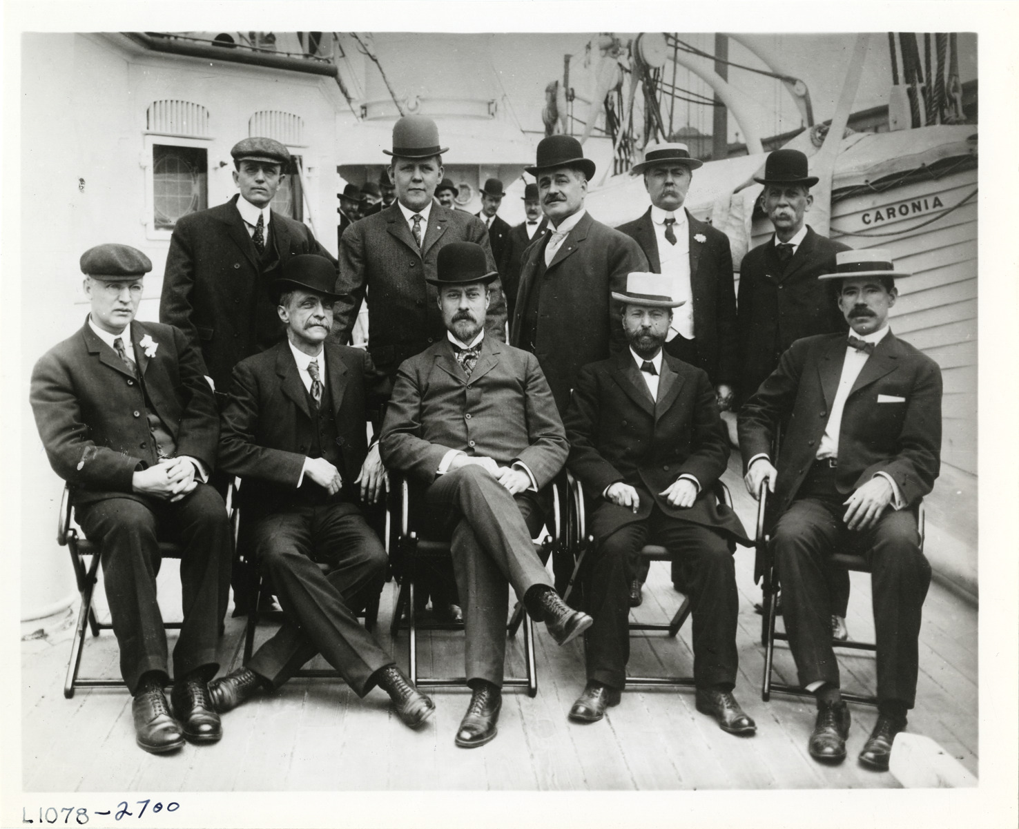 Group portrait of engineers from Association of Licensed Automobile Manufacturers on deck of ship. Handwritten on back: "Clubs-Association of Licensed Automobile Manufacturers. American engineers who visited England for English engineers meeting."
