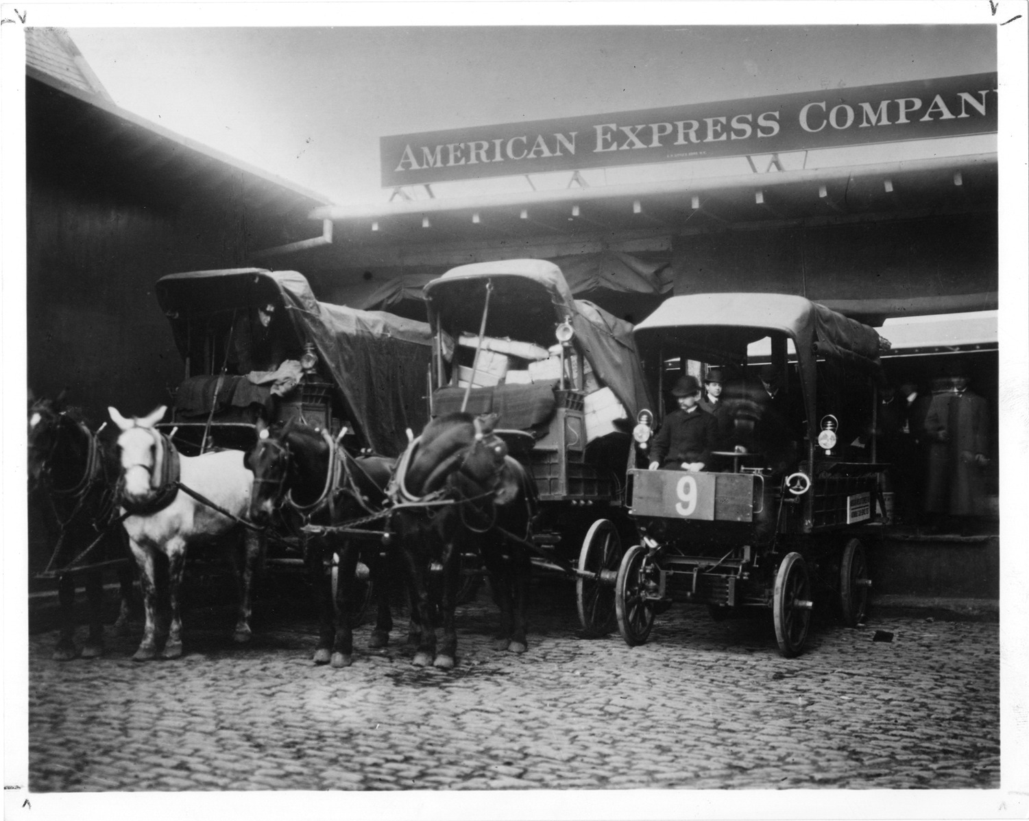 View of horse-drawn wagons and truck under American Express Company sign. Typed on back: "From left to right: some horses, a horselaugh, and a rickety ancestor of today's powerful motor trucks. The occasion was a test run involving an express company (prior to occurences outlined on page 6), in which the Automobile Club of America attemped to prove that horses would run a poor second as far as efficiency was concerned, to the waddling motor wagons of the period. Seventeen of these early trucks puffed and rumbled for six days over 16 express routes devised by the ACA for the test run. Loads varied from pig iron, to department store packages, to veal, to giant kegs of beer. Number 9 shown above, was a friction-drive Consolidated Motor Truck, vintage 1904. Trucks came through the test with flying colors, making more deliveries, better time, travelling farther, and, to boot, occupying half the ground spece required by horses and wagons, but many years passed before approval of the truck ousted the horse." Handwritten on back: "Clubs-Automobile Club of America, interior, 1908."