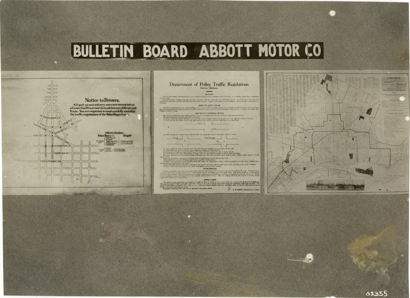 View of Abbott Motor Company bulletin board with Detroit maps and memo with heading: "Department of Police, traffic regulations, Detroit, Michigan." Handwritten on back: "Companies--Abbott Motor Co., 1911. (Produced the 'Abbott-Detroit' motor car from 1909 to 1916). Abbott Motor Car Co., bulletin board."