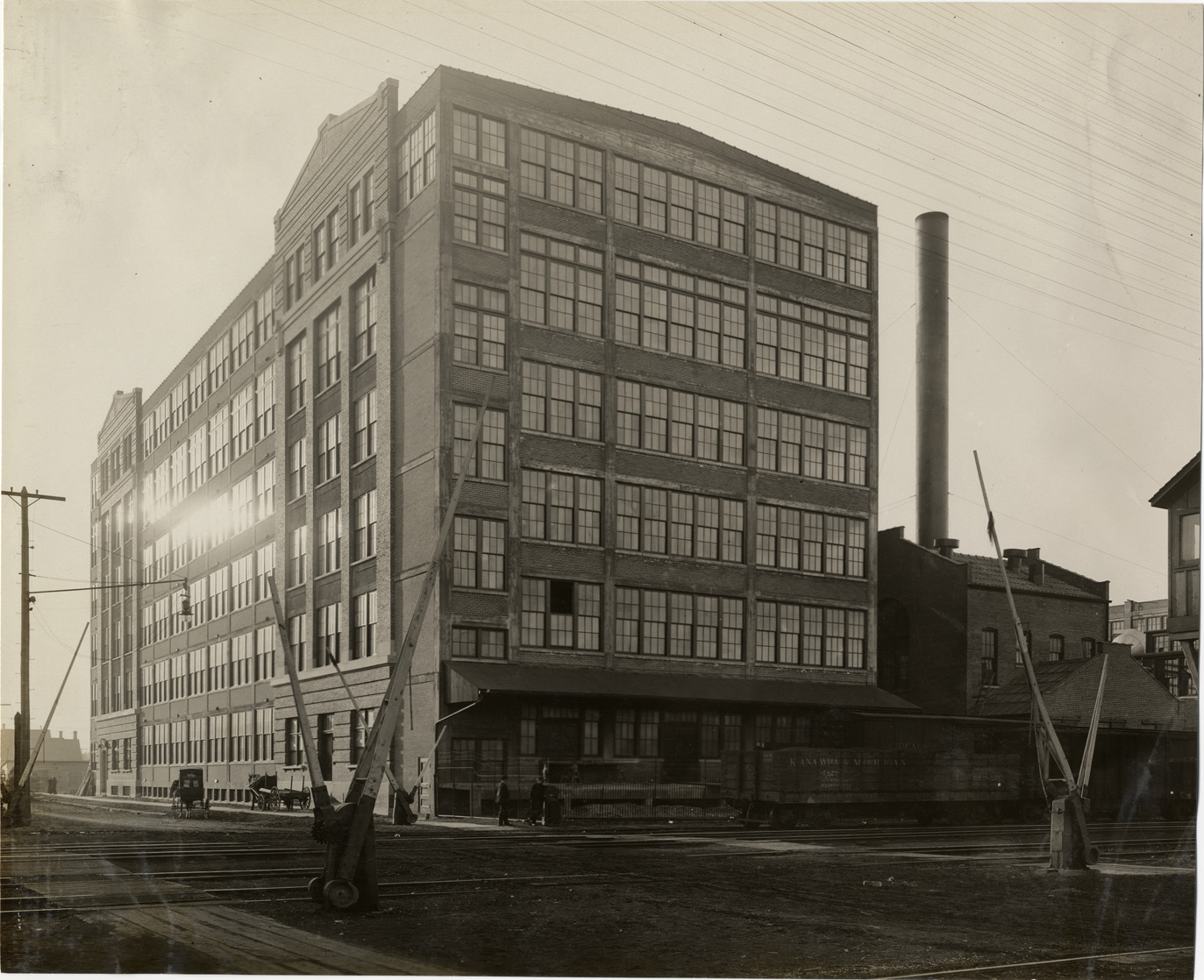 View of multistory brick Bagley Tobacco Company factory. Brick building with smokestack adjacent to factory; railroad car and tracks in foreground. Handwritten on back: "Companies, Bagley Tobacco Co., Detroit, Mi., 1910. Bagley Ave."