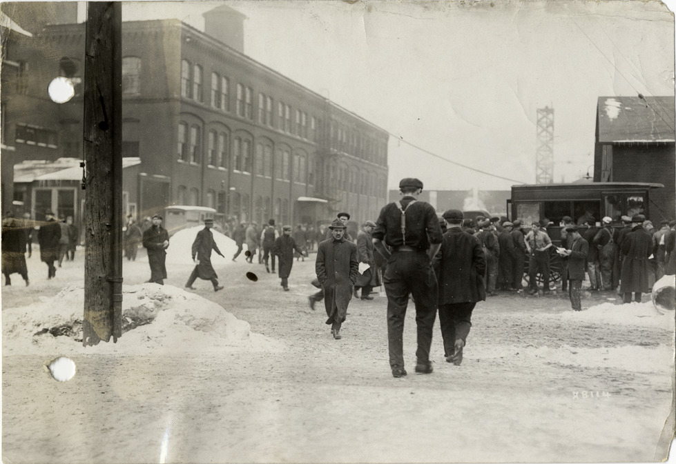 View of workers leaving Cadillac Motor Car Company factory during winter; group of men stand near wagon. Stamped on back: "Spooner & Wells, Inc., photographers, 1231 Woodward Ave., Detroit, Mich." Handwritten on back: "Companies--Cadillac. Workmen leaving Cadillac Motor Car Co."