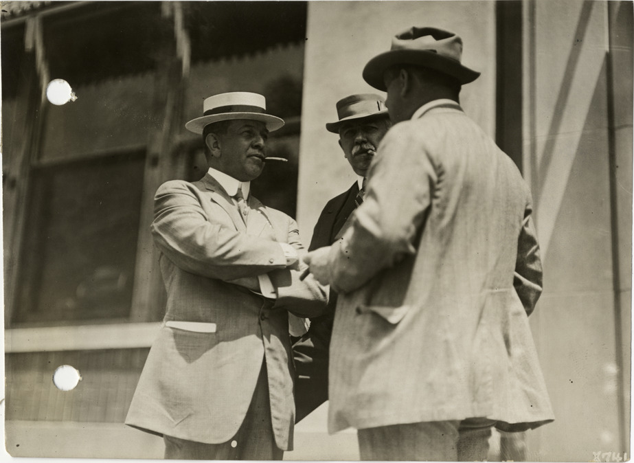 View of three men, wearing suits and hats, standing outside Ford Motor Company factory. Stamped on back: "Spooner & Wells, Inc., photographers, 1231 Woodward Ave., Detroit, Mich., telephone North 1745." Handwritten on back: "Companies--Ford. At Ford factory."