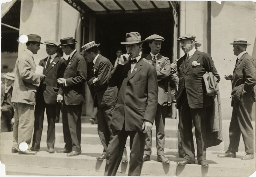 View of group of men, wearing suits and hats, standing outside Ford Motor Company factory. Stamped on back: "Spooner & Wells, Inc., photographers, 1231 Woodward Ave., Detroit, Mich., telephone North 1745." Handwritten on back: "Companies--Ford. At Ford factory. Maehle, Farrell, Slocum, Beecraft, McMurty."