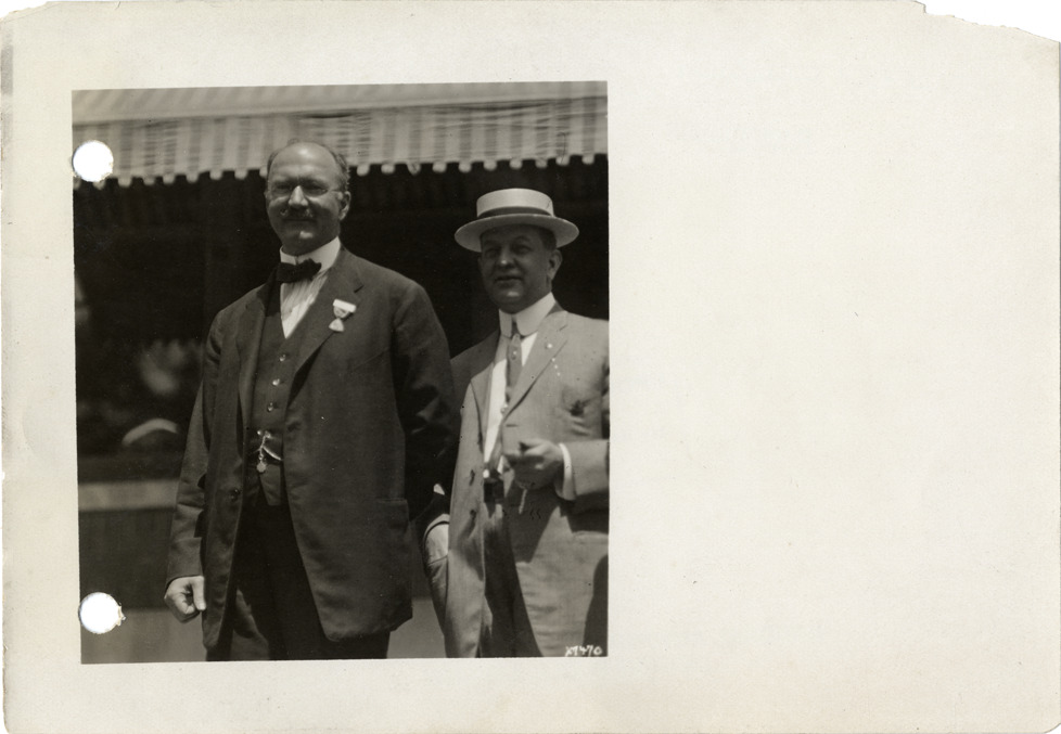 View of two men, wearing suits and hats, standing outside Ford Motor Company factory. Stamped on back: "Spooner & Wells, Inc., photographers, 1231 Woodward Ave., Detroit, Mich., telephone North 1745." Handwritten on back: "Companies--Ford. At Ford factory."