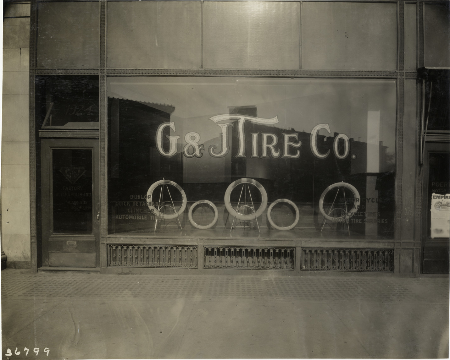 View of tires in display window of G & J Tire Company. Stamped on back: "Spooner & Wells, Inc., photographers, telephones 3472-3473 Columbus, 1931 Broadway, New York." Handwritten on back: "Companies--G. & J. Tire Co., New York, 1910."