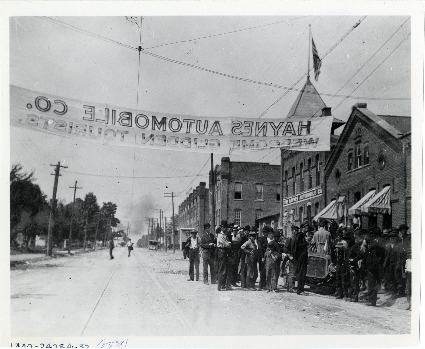 Banner welcoming Glidden tourists outside Haynes Automobile Company building