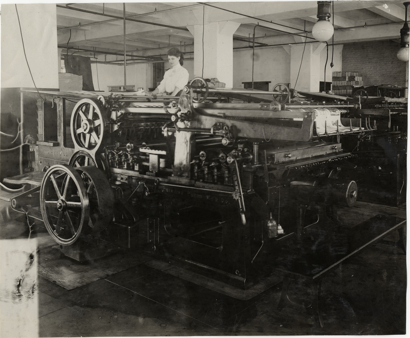 View of woman working at Optimus printing press at Life Magazine. Handwritten on back: "Companies--Life Magazine, 1908. Life offices."