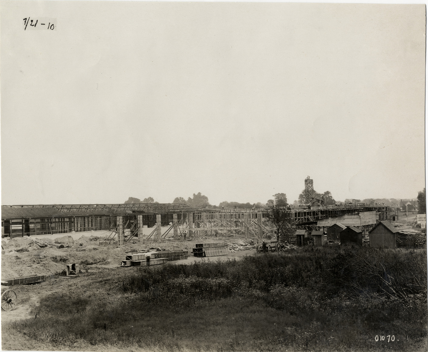 Favorite this☆ Lozier Motor Company factory under construction Description: View of framework for Lozier Motor Company factory during construction; wooden-frame outbuildings on right. Handwritten on front: "7/21-10." Handwritten on back: "Companies--Lozier Motor Co., 1910." Details Resource ID: na005658 Subject: Lozier Motor Company Automobile factories--Design and construction Building sites Structural frames Photographic prints Date Issued: 1910-07-21 Format: 1 photographic print mounted on fabric ; 7.75 x 9.5 in. Member of: National Automotive History Collection Lazarnick Collection Filing Location: Companies--Lozier Motor Co. #1 Rights: Physical rights are retained by DPL. Copyright is retained in accordance with U.S. copyright laws.