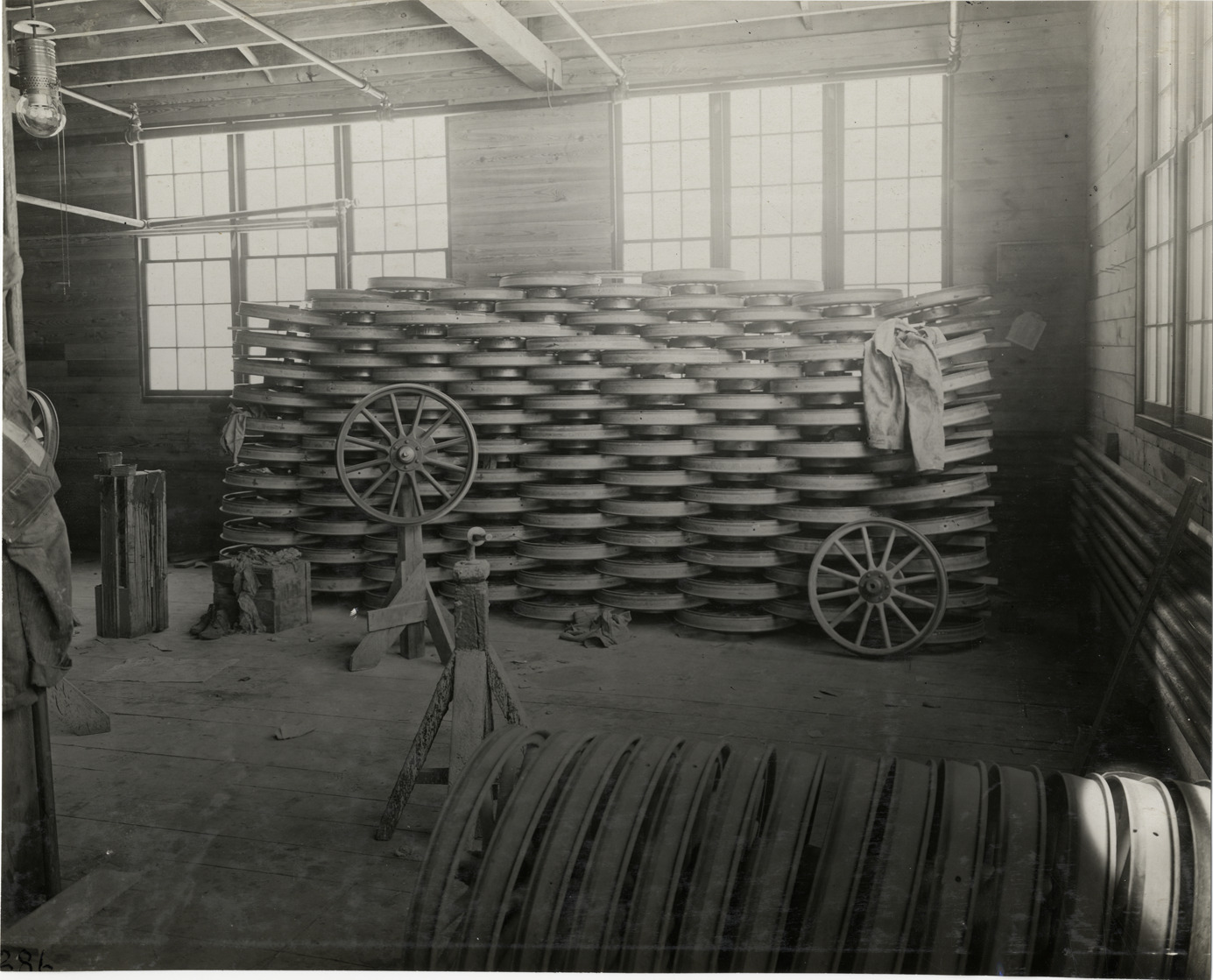 Favorite this☆ Automobile wheels, Metzger Motor Car Company factory Description: View of stacks of automobile wheels at Metzger Motor Car Company factory. Handwritten on back: "Companies--Metzger Motor Car Co., 1910." Details Resource ID: na005702 Subject: Metzger Motor Car Company Automobile factories Automobiles--Wheels Photographic prints Date Issued: 1910 Format: 1 photographic print ; 7.5 x 9.25 in. Member of: National Automotive History Collection Lazarnick Collection Filing Location: Companies--Metzger Motor Car Co. Rights: Physical rights are retained by DPL. Copyright is retained in accordance with U.S. copyright laws.