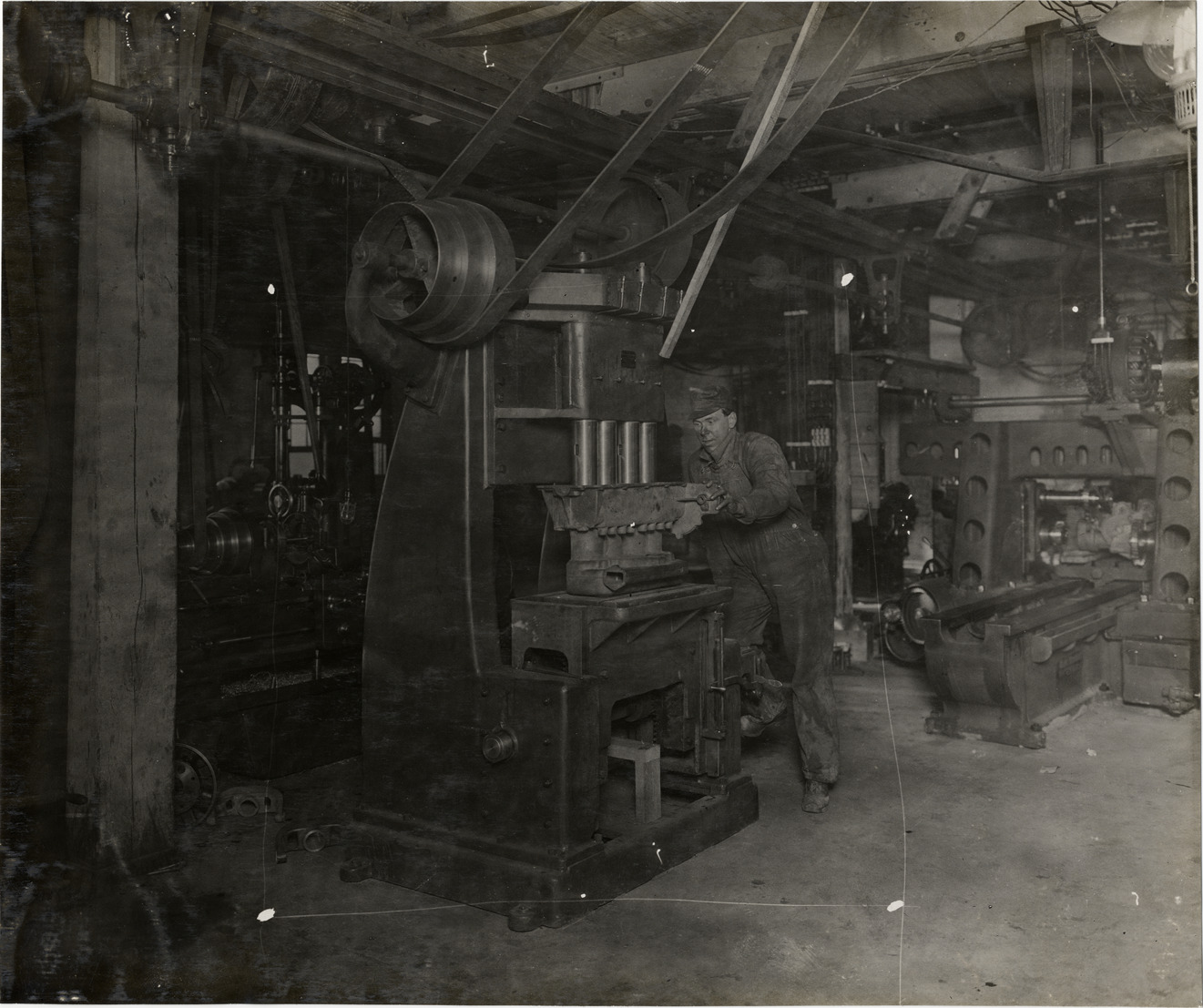 View of man operating machine at Metzger Motor Car Company factory. Handwritten on back: "Companies--Metzger Motor Car Co., 1910."