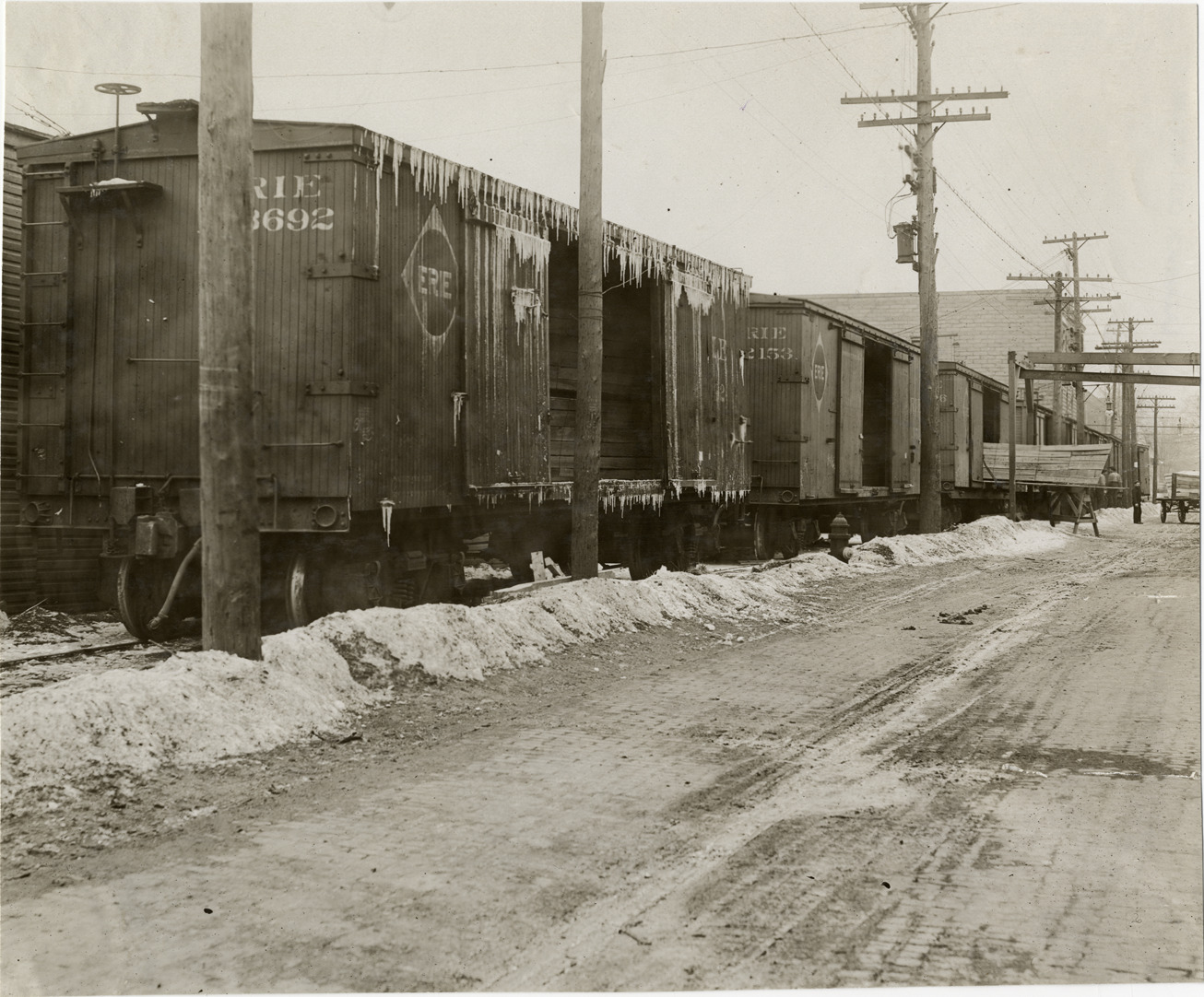 View of wooden crate into railroad car being loaded into railroad car at Michigan Steel Boat Company. Stamped on back: "Spooner & Wells, Inc., photographers, telephone North 1745. 1231 Woodward Ave., Detroit, Mich. Detroit, 1231 Woodward, New York, 1931 Broadway." Handwritten on back: "Companies--Michigan Steel Boat Co., 1910."