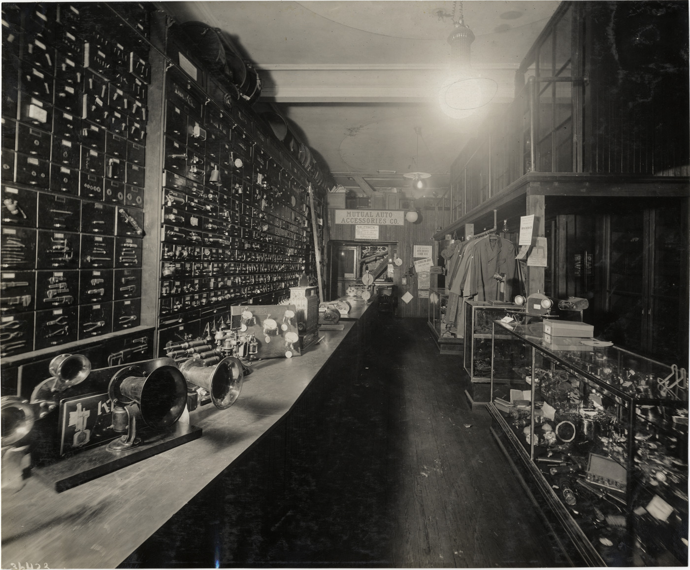View of interior of the Mutual Auto Accessories Company of America store. Rows of drawers containing parts and tools and wall; display case and apparel rack on right. Stamped on back: "Spooner & Wells, Inc., photographers, telephones 3472-3473 Columbus, 1931 Broadway, New York." Handwritten on back: "Companies--the Mutual Auto Accessories Co., 1910."