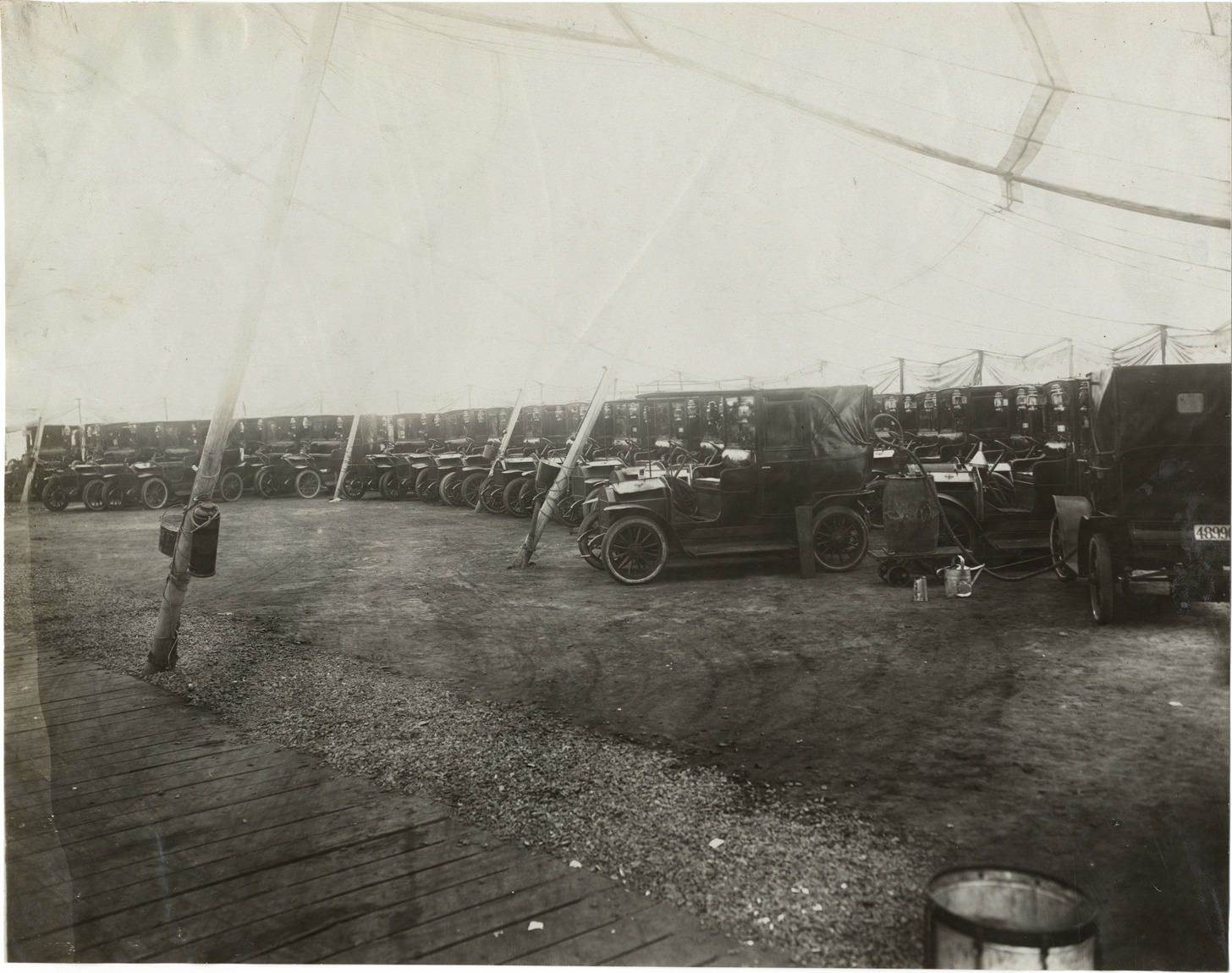 View of Darracq taxis under tent at New York taxicab enclosure. Handwritten on back: "Companies--New York taxicab enclosure, 57th & Broadway, 1908. Darracq taxis."